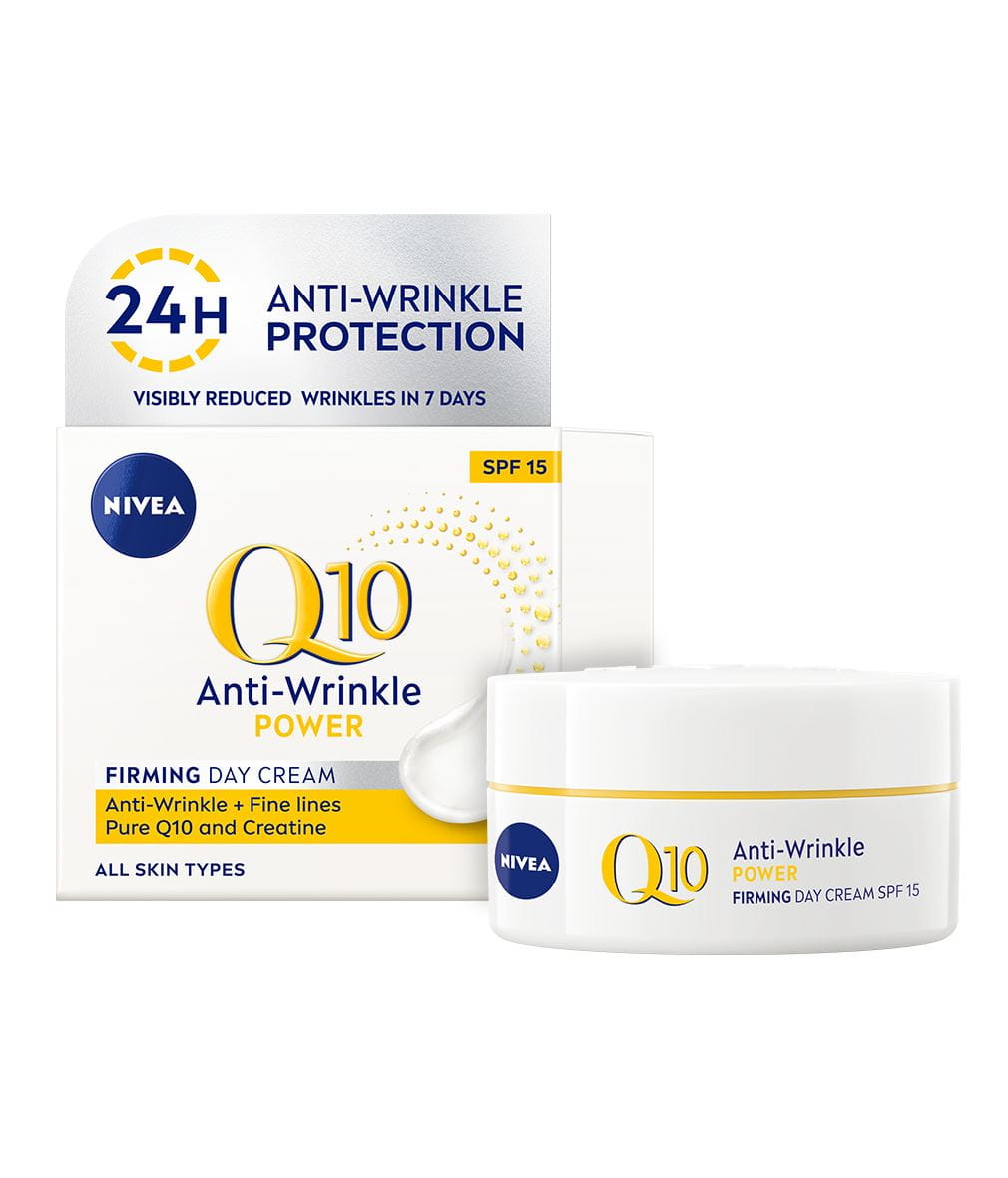 NIVEA Q10 Anti-Wrinkle POWER Firming Day Cream is enriched with Dual Action Coenzyme Q10, Creatine and SPF 15 to ensure 24h anti-wrinkle action, for visibly firmer skin and reduced wrinkles in 7 days.