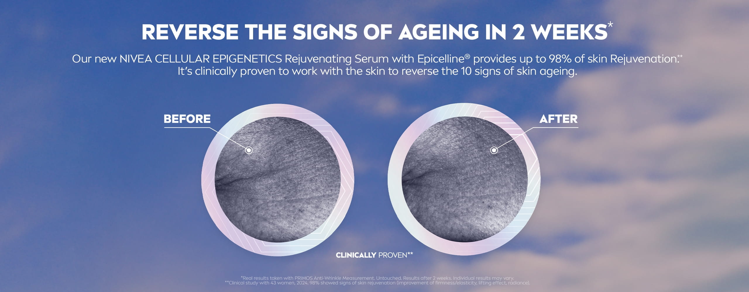 Now you can, using cutting-edge ingredients in your skin routine to defy time with our most groundbreaking skincare innovation yet, NIVEA CELLULAR Epigenetics - Rejuvenating Serum with EPICELLINE®. It’s simple: skincare that actually works