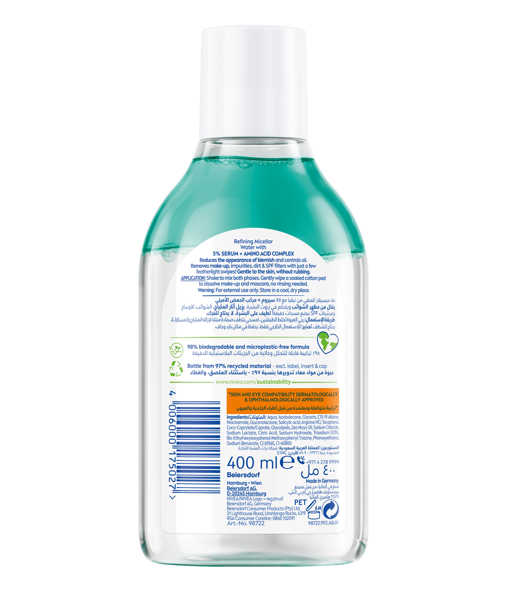For visibly clearer skin with 5% Serum Power infused with PHA, Salicylic Acid & Niacinamide. Removes up to 100% of waterproof make-up and SPF filters while reducing the appearance of blemishes.