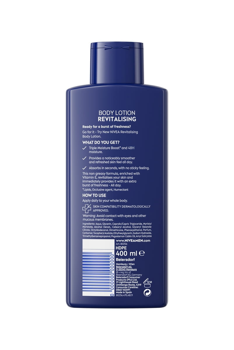NIVEA MEN Revitalising Body Lotion delivers 48 hours of intense hydration with its Triple Moisture Boost formula. Fast-absorbing and non-greasy, it revitalizes skin with Vitamin E, leaving it smooth, refreshed, and ready for the day.