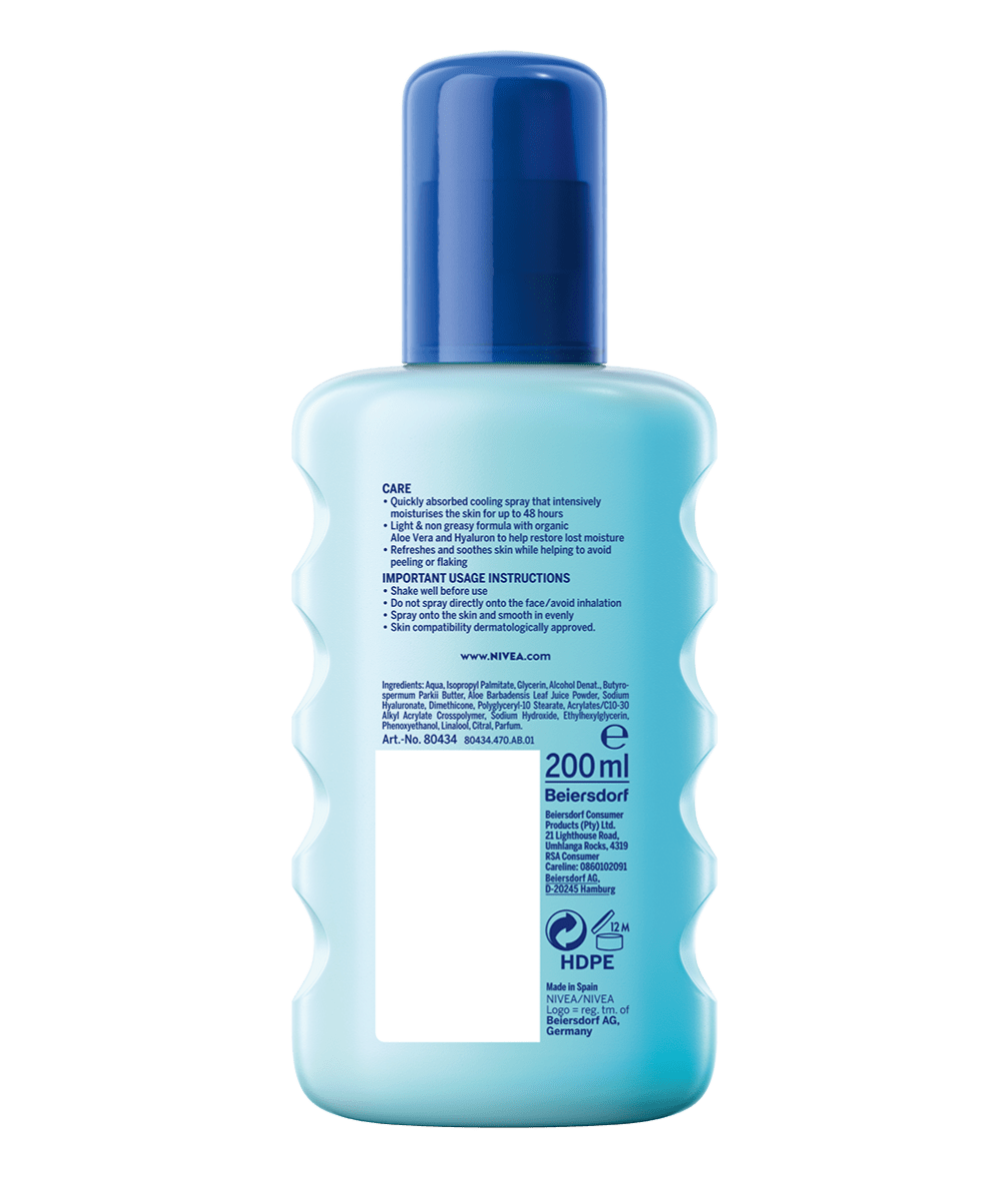 NIVEA SUN After Sun Moisture Spray 200ml is cooling and soothing the skin after sun exposure and instantly relieves signs of sun-stressed skin. The light caring formula with Bio-Aloe Vera and Hyaluron provides 48h moisture and helps to restore skin's moisture loss. Its non-greasy formula absorbs quickly, helps to avoid peeling or flaking and comes in a convenient spray for easy application. Skin compatibility dermatologically approved.