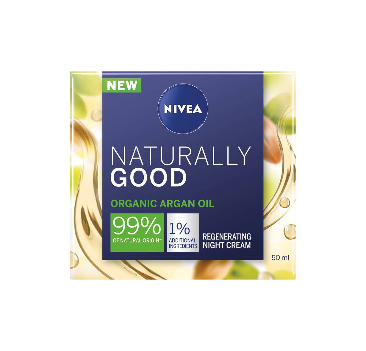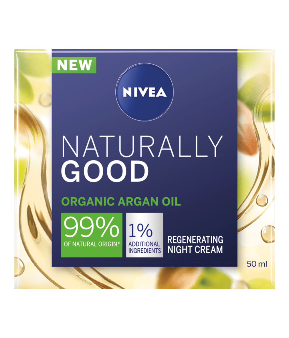 NIVEA Naturally Good Organic Argan Oil Night Cream made with 99% of natural origin ingredients* offers 100% transparency for you and your skin. The caring formula with rich Organic Argan Oil supports skin regeneration overnight - for supple and refreshed looking skin in the morning | 50ml