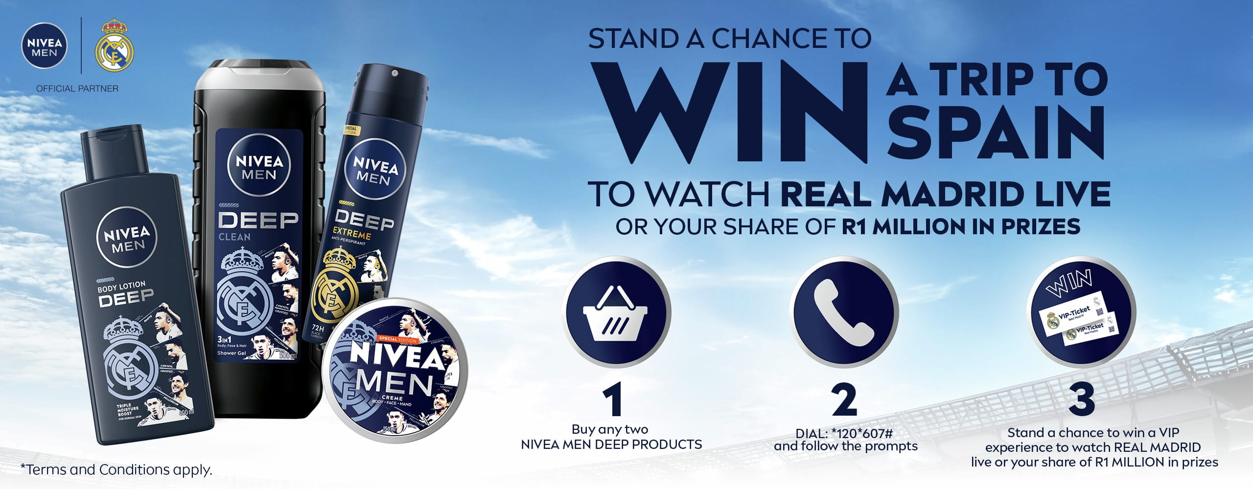 Enter the NIVEA MEN x Real Madrid competition for your shot at 2 tickets to see Real Madrid live in Spain, including exclusive stadium access, the chance to watch the players train, and official merch.